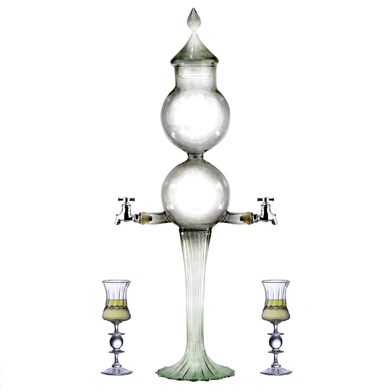 This absinthe fountain features 2 plastic pour spouts and a stacked double globe basin for holding ice water. The fountain itself is made of clear mouth-blown glass and stands 20.75″ tall with approximately 8.75″ of space below the spouts. The double stacked globe basin holds up to 0.9 liters of liquid and provides and elegant aesthetic to the fountain. It was during the 19th century these fountains became very popular. The Absinthe Fountain was usually found in higher end bars and clubs as it was quite expensive to purchase. This is not always so now, as they become more and more poplar in today’s bar scene and is now available at a more accommodating price.