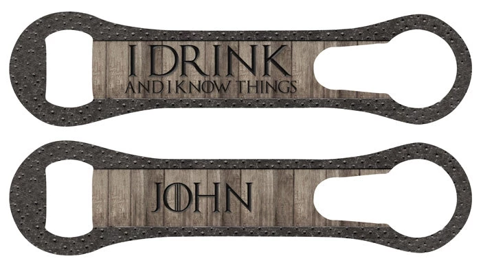 I Drink and I Know things… we can’t argue with this clever quote. Now you can use the I Drink V-Rod® Bottle Opener to help you open all those beers and drink even more. Adding your name or text of your choice is optional, but is a super awesome way to claim your bottle opener. Just choose type the text you would like printed on the opener and our designers do the rest! Custom bottle openers make great gifts for yourself or your favorite bartender.
