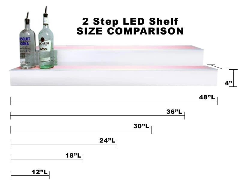 LED Liquor Bottle Display Shelves are a great way to showcase your different types of liquor brands. It grabs the attention of your guests while creating a fun ambiance decor to your bar. These 2 step (tier) shelves are manufactured right here in our USA Woodshop. Each shelf showcases a high quality craftsmanship that is durable and built to last at an unbeatable price.
