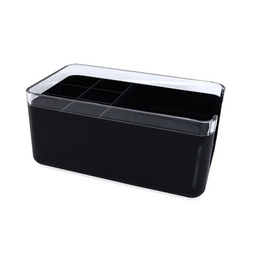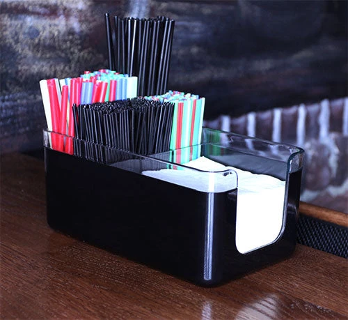 Our Deluxe 2pc Bar Caddy’s are not only extremely fashionable when it comes to Bar Decor and a classy presentation, but they are durable and offer several compartments, perfect for organizing your service stations. The larger compartment holds a large stack of your standard sized cocktail napkins (or drink coasters) and the other smaller compartments are separated into 6 areas where you can organize your drinking straws, cocktail stirrers, cocktail picks and anything else you need to complete your cocktail presentations. The inner body of this bar caddy napkin holder is a tough clear plastic, and then you have the option of choosing between a white or black outer casing. This caddy conveniently separates for easier cleaning. The bottom (base) features 4 smalls rubber balls built in, to prevent sliding and scratching of your bar top. Measures: 4.25″ tall, 9.25″ length and 5.5″ width.
