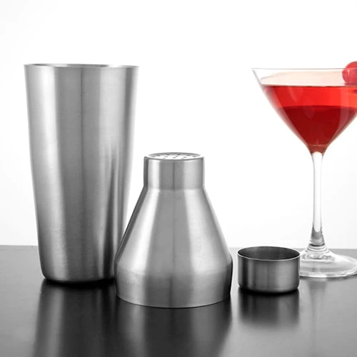 This unique 3 piece shaker is contructed of brushed stainless steel. It features a 28oz shaker tin with an elongated middle section (strainer) which fits snug inside the tin rather than outside allowing for less spillage. This Tapered Metal Shaker is not only elegant looking but it also is an ideal alternative to the standard 3 piece shaker