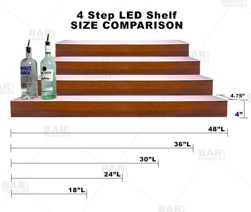 LED Liquor Bottle Display Shelves are a great way to showcase your different types of liquor brands. It grabs the attention of your guests while creating a fun ambiance decor to your bar. These 4 step (tier) shelves are manufactured right here in our USA Woodshop. Each shelf showcases a high quality craftsmanship that is durable and built to last at an unbeatable price.