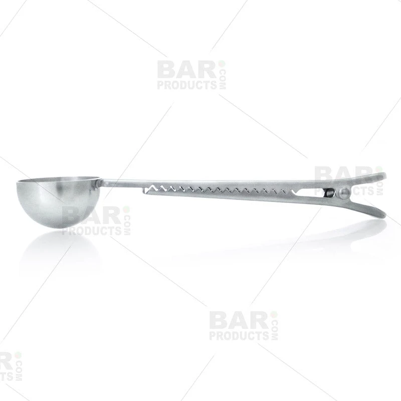 Have you been looking for an all-in-one tool for scooping, measuring and storing coffee, espresso, tea or other dry condiments? This stainless steel Café Clip is the perfect barista tool for all of your scooping and storing needs! The scoop itself holds 2 TBPS (10g) with a handle that also functions as a convenient bag clip.