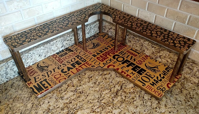 This particular shelf features a trendy coffee collage design imprint along with a smooth stained finish that easily wipes clean. They are also sold with rubber feet on the bottom, giving the shelf a bit of a raise from your counter while protecting it from scratches and bacteria build up.