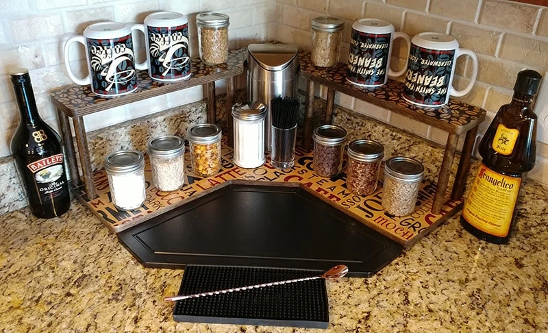 These 2 tier shelves are designed to fit perfectly in the corner, on the counter underneath your cabinets. The 7.5″ tall dowel rods lift the 2nd tier up, allowing the perfect amount of space on the bottom and top tiers to hold your Barista related supplies such as sugars, creamers and other condiments. The center of the unit showcases a half circle cutout that you can conveniently slide up to a 4.5″ diameter trash can into.