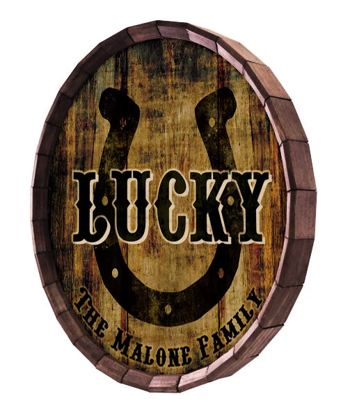 Feeling lucky? If so, then this customizable Barrel Top Sign is the perfect decor for your home! This rustic design has an aged feel that looks like it came right out of a barn or from an old country store. We have also left a space for you to customize this sign and really make it your own! Add your family name, bar name, favorite saying, or anything you would like. Barrel top signs are hand crafted by skilled artisans and make great birthday, holiday, or house warming presents!
