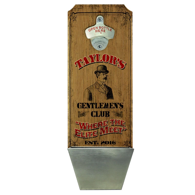 Home and bar decor can certainly set the tone for your guests. They can also make for great conversation pieces! This Vintage Style Gentlemen’s Club wall mounted bottle opener and cap catcher will do just that. The best part is that it is completely customizable. All you need to do is simply type in the required fields with your text and we will custom design this very cool, distressed wooden bottle opener for you. Think about how excited your friends and family will be when they receive this gift personalized with their name or favorite phrase.