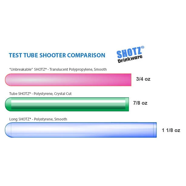 7″ Assorted smooth test tube shot glasses are the Largest test tubes on the market. This is a great way to sell more shots and shooters at your club or bar. These affordable shooter tubes come in 4 attractive colors that glow under a black light or a clear version that allows the shot inside the tube to be seen. They are also taller than other test tube glasses to draw more attention to them as waitresses and shooter girls carry them around. Purchase plastic test tube shooters as singles, or buy in large quantities for bigger savings.