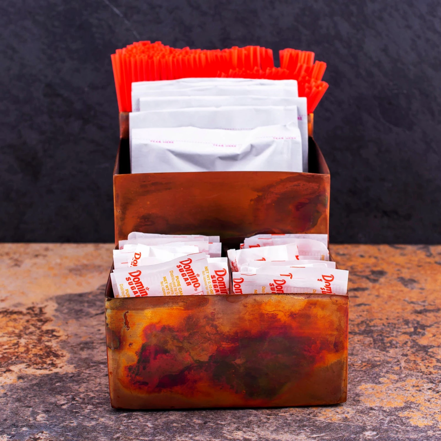 This very unique and beautiful coffee condiment caddy that is sure to stand out. It has a distinctive antique copper design that features 4 compartments that can be used for spoons, sugar packets and other supplies. This caddy measures 4″ wide and is 8″ in length.