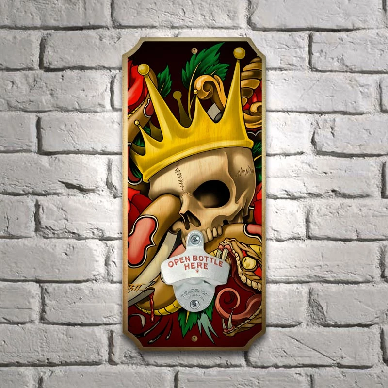This Wall Mounted Bottle Opener with “The King Tattoo” art from Featured Artist William Webb is the perfect way to open beer bottles in your kitchen, bar, or even on the patio! It features a durable cast iron bottle opener and has 2 pre-drilled holes so you can mount it on any wall. The art is printed directly onto the wood in bright, vivid colors, making this a bottle opener that really stands out!