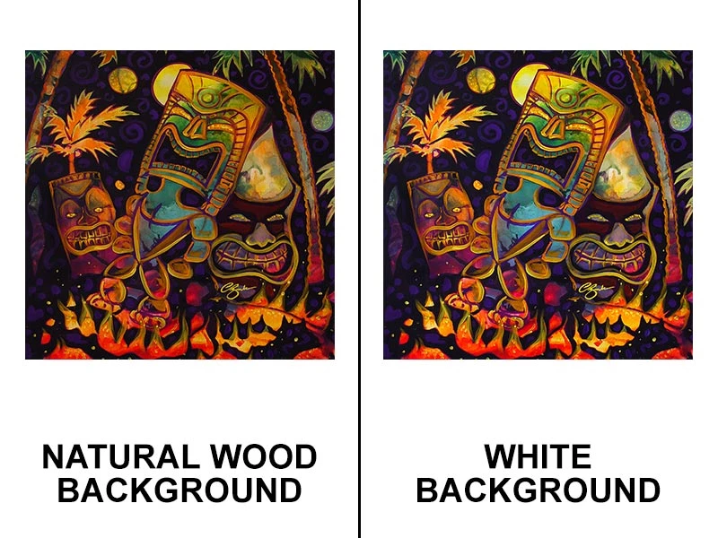 Available in either a Natural Wood background or a White background. The texture of the wood shines in the Natural Wood option, while the whites from the art are more vivid with the White option.