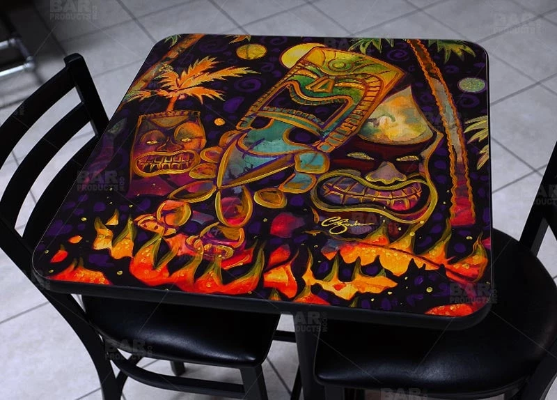 The Tiki Fire Night Square Wooden Table features the beautiful art of CBjork, one of many Featured Artists here on BarProducts.com. Click here to see more Featured Artists.