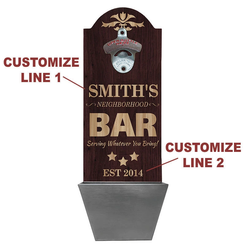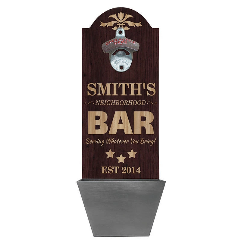 Customize your very own “Neighborhood Bar” themed wall mounted bottle opener! This cool, trendy design is perfect for those guys who enjoy a few cold ones with their buddies on the weekends.