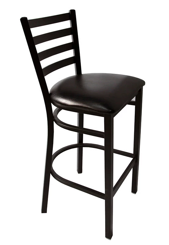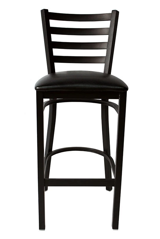 BAR STOOL: This Black Ladder Back Metal Restaurant Bar Stool with Black Vinyl Seat is perfect for bars, lounges, restaurants, homes and hotels. It features a 2.5” thick foam padded (vinyl) seat on an 18 gauge steel frame with 2 curved support bars and a foot rest rung. Its welded joint assembly meshes with the black powder coated frame finish. Each leg has plastic floor guides to protect any surface. Overall dimensions: 42.25”H x 17”W x 18”D. See more and purchase.