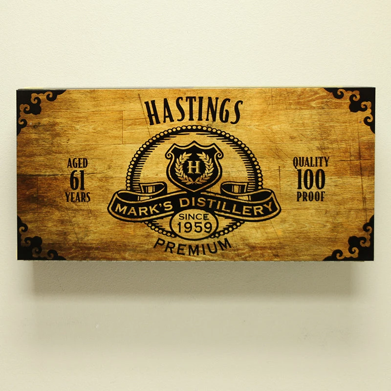 The Murphy WalBAR™ is custom built in our USA based woodshop. It has been meticulously designed in favor of the home bar enthusiast. Measuring 18″H x 36″W x 7.5″D it securely attaches to your wall space with a French Cleat (included). When not in use, the bar can remain latched and closed to showcase a customizable design such as this Distillery theme design. All you need to do is type in your text with your personal information and you have yourself this gorgeous signature piece. The unprinted sides, top, bottom and inside are finished with a beautiful dark walnut stain.