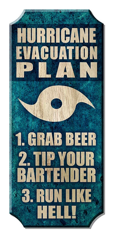 If you are a bar located in those annoying hurricane hot spots, it will do you well to provide a “Hurricane Evacuation Plan” to your patrons. We think this hand-crafted Wooden Sign spells it out pretty accurately. Priorities!