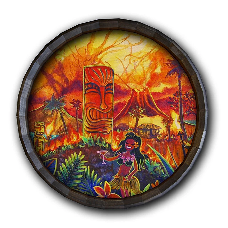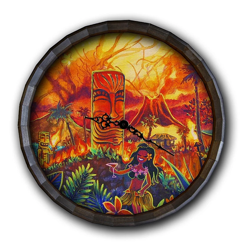 The Lucky Tiki Wood Barrel Top Sign or Clock features the whimsical and fun art of CBjork. This bright scene features happy tiki vibes that will look great hung anywhere! The art comes straight from painter CBjork, and even though it is a print, it looks like it was painted right on the Barrel Top!